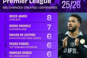 本赛季英超后卫创造重大机会榜:詹姆斯居首,多尔古、库库在列